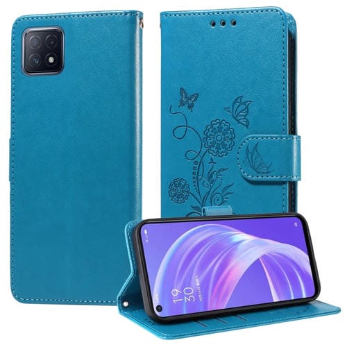 Funda de Cuero con Diseño de Mariposas y Flores En Relieve para Oppo A92S/A53 5G/A72 5G/A73 5G (Azul)