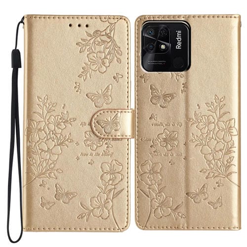 Funda de Cuero con Diseño de Mariposas y Flores para Redmi 10C (Dorada)