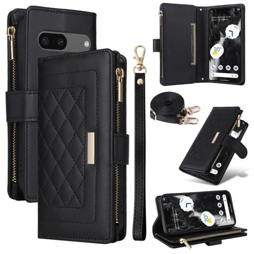 Funda de Cuero con Diseño de Rombos y Billetera Cruzada con Cremallera para Google Pixel 7 (Negra)