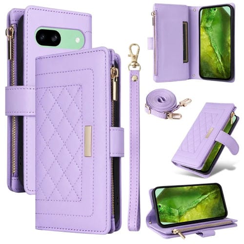 Funda de Cuero con Diseño de Rombos y Billetera Cruzada con Cremallera para Google Pixel 8A (Morado)