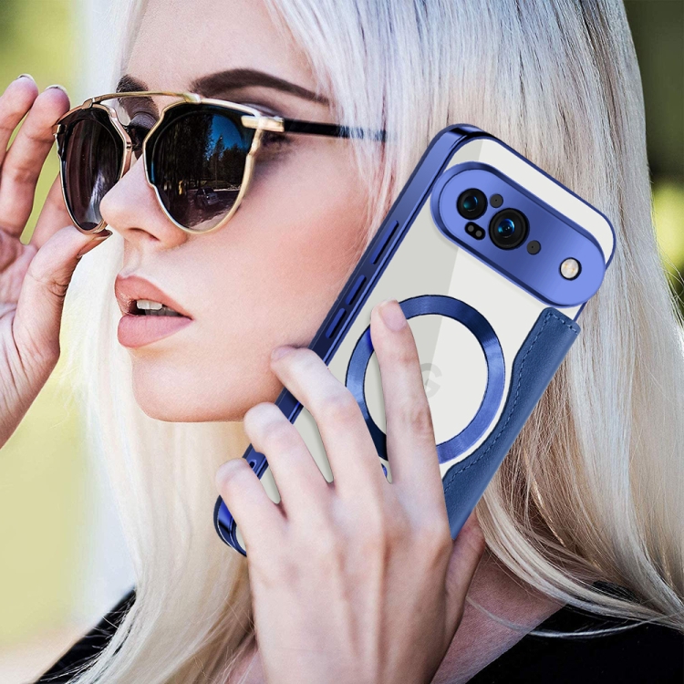 Funda de Cuero para Google Pixel 9 con Diseño de Rombos, Protección Rfid y Magsafe (Azul Oscuro)