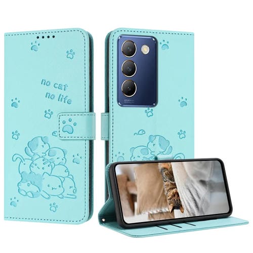 Funda de Piel con Estampado de Gatito y Cordón para Vivo Y100 Idn / Y200E 5G (Verde Menta)