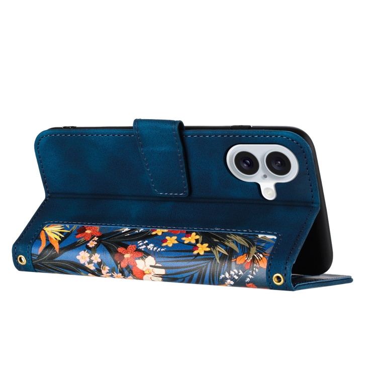 Funda de Cuero para iPhone 16 Plus con Estampado Floral y Cordón (Azul Oscuro)