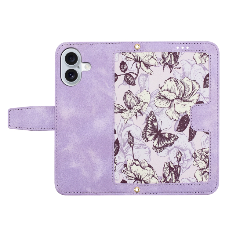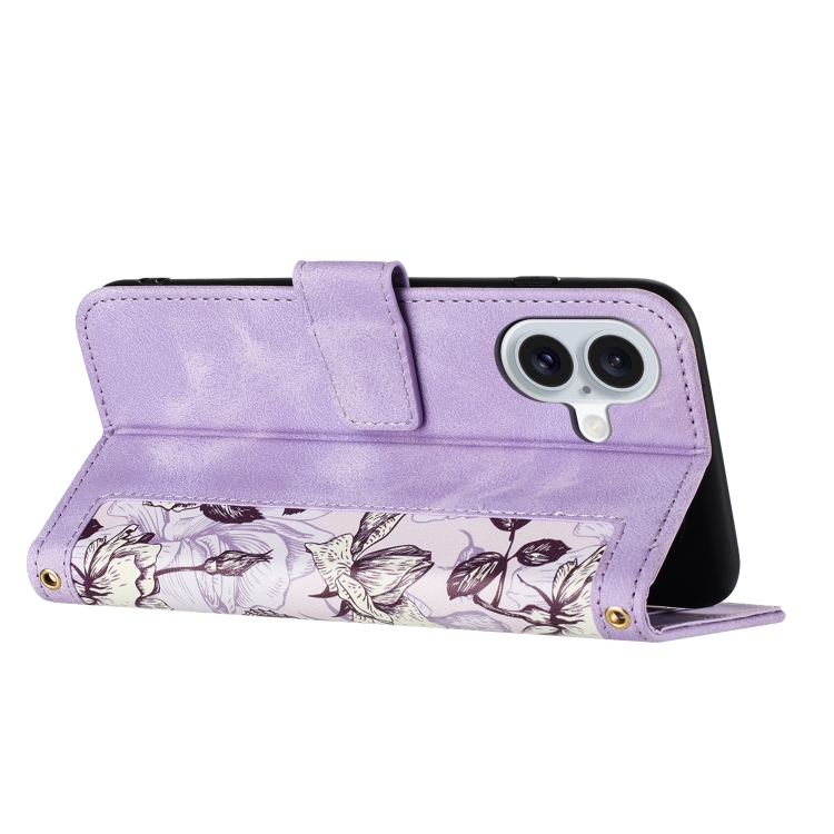 Funda de Cuero para iPhone 16 Plus con Estampado Floral y Cordón (Morado Claro)