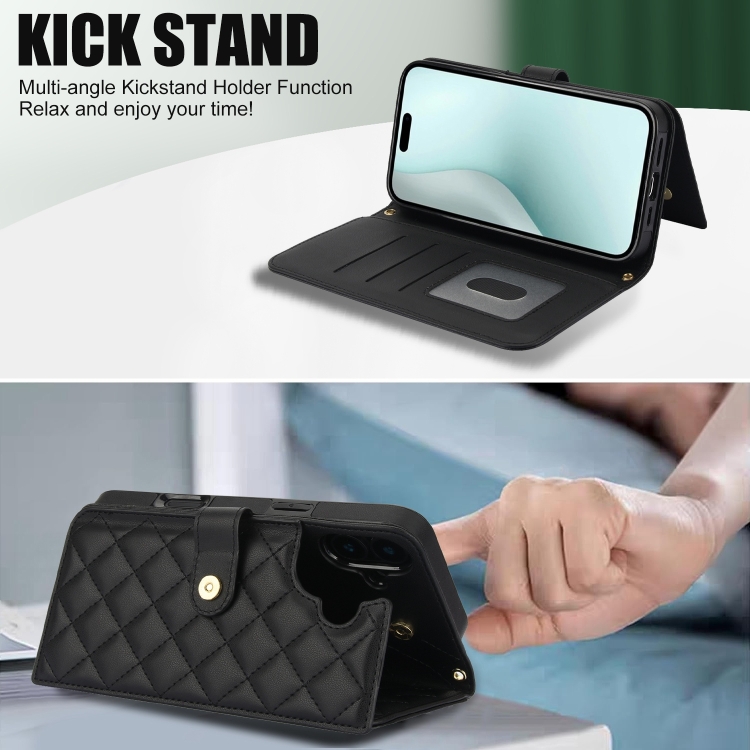 Funda de Cuero para iPhone 16 Plus Forma de Rombos Multifunción (Negra)
