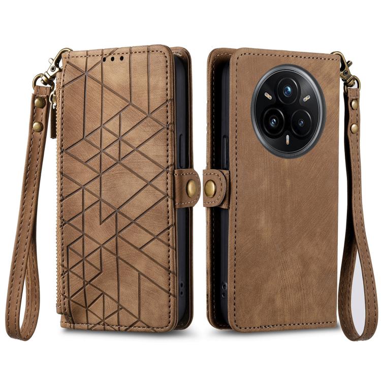 Funda de Cuero con Hebilla Lateral y Cremallera Geométrica para Realme 14 Pro+ (Marrón)