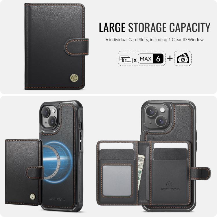 Funda de cuero con hebilla magnética para iPhone 15 JEEHOOD J09, con ranuras para tarjetas, estilo RFID y MagSafe (negro)