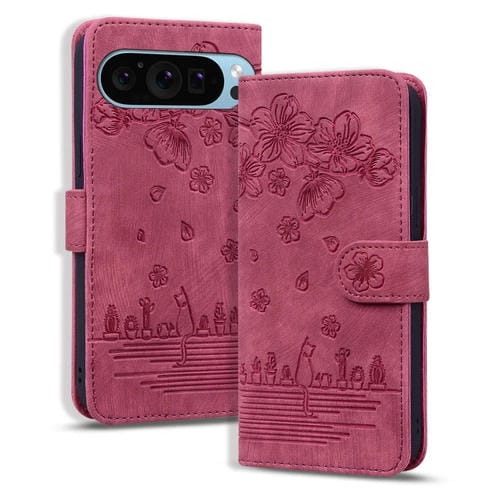 Funda de Cuero con Relieve de Gato Sakura para Google Pixel 9 Pro XL (Rojo)