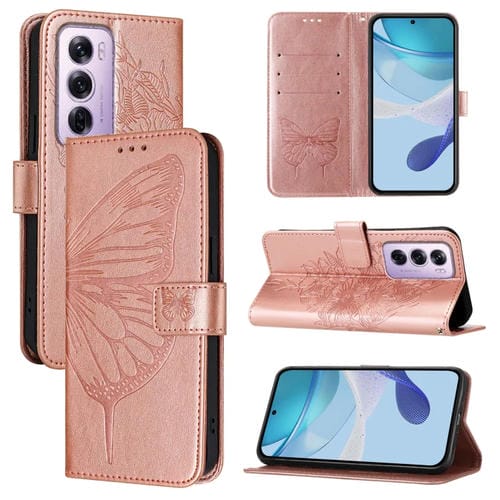 Funda de Cuero con Relieve de Mariposa para Teléfono Oppo Reno12 Pro 5G (Oro Rosa)