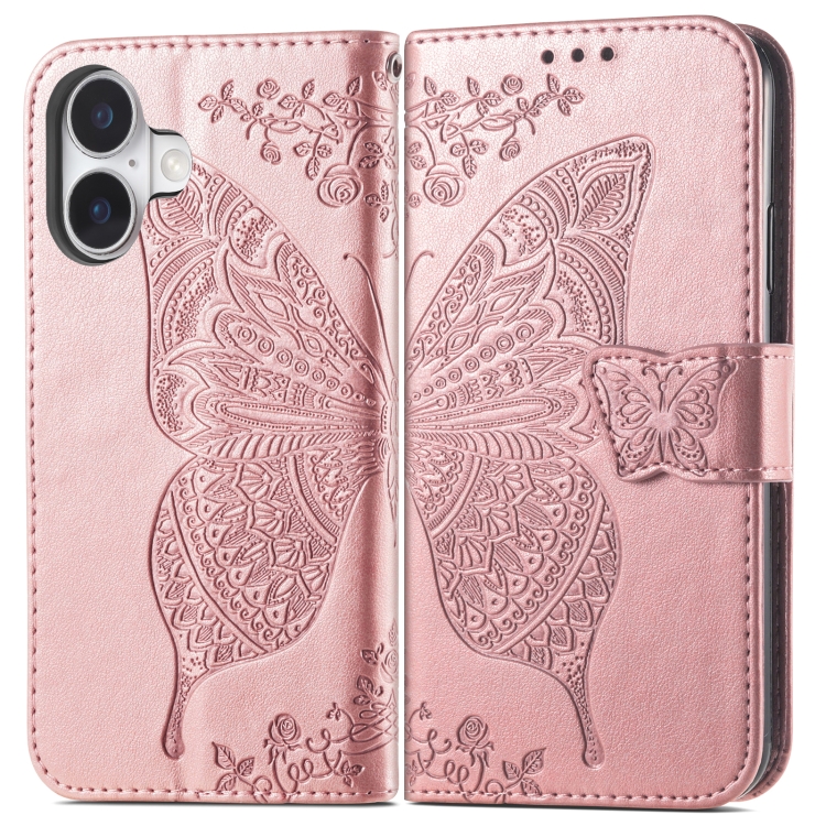Funda de Cuero iPhone 16 Relieve Mariposa y Flor (Oro Rosa)