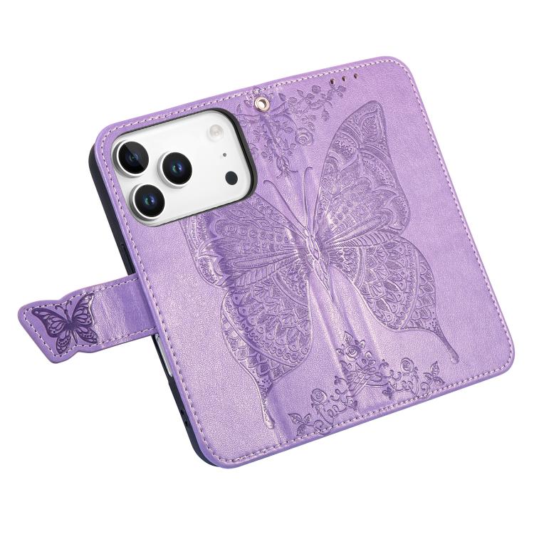 Funda de cuero con relieve de mariposa y flor para iPhone 17 Pro (lavanda)