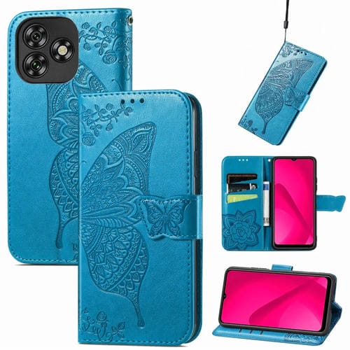 Funda de Cuero con Relieve Mariposa y Flor para Teléfono Oukitel C53 (Azul)