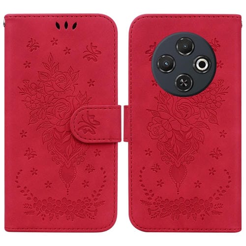 Funda de Cuero con Relieve Mariposa y Rosa para Tecno Spark 30C (Rojo)