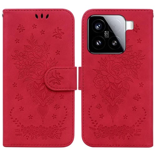 Funda De Cuero Con Relieve De Mariposa Y Rosa Para Xiaomi 15 (Roja)