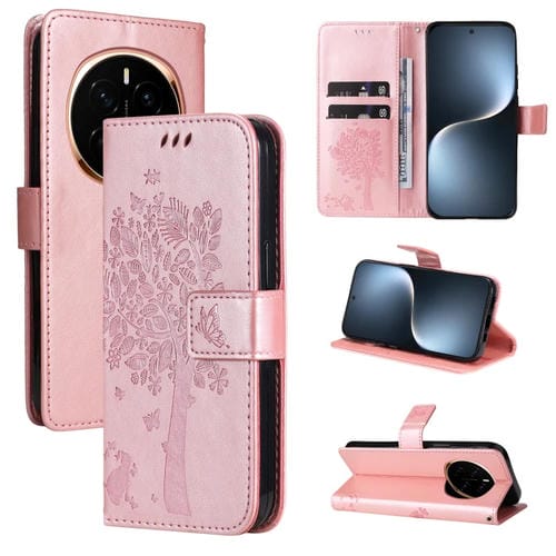 Funda de Cuero con Tapa para Honor Magic7 Estampado Árbol y Gato (Oro Rosa)