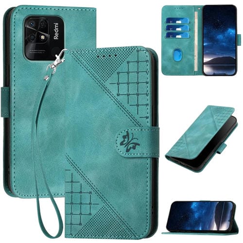Funda de Cuero con Tapa y Cordón para Redmi 10C Yx0080 con Diseño En Relieve de Mariposa y Cuadrícula (Azul Claro)
