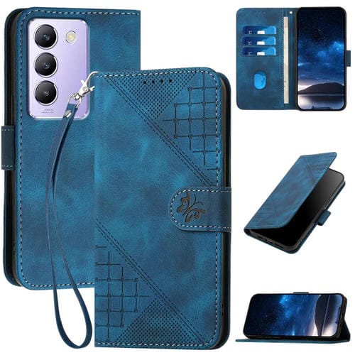 Funda de Cuero con Tapa y Cordón para Vivo T3 5G Idn Yx0080 con Diseño En Relieve de Mariposa y Cuadrícula (Azul Oscuro)