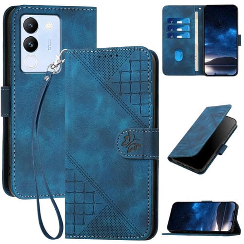 Funda de Cuero con Tapa y Cordón para Vivo V30 Lite 5G Global Yx0080 con Diseño En Relieve de Mariposa y Cuadrícula (Azul Oscuro)