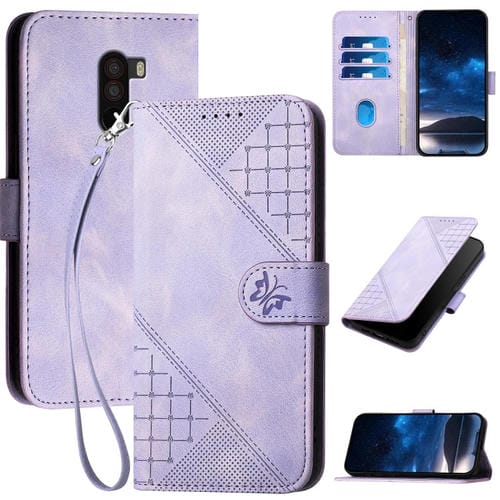 Funda de Cuero con Tapa y Cordón para Xiaomi Pocophone F1 Yx0080 con Diseño En Relieve de Mariposas y Cuadrícula (Morado Claro)