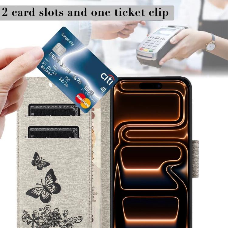 Funda de cuero con tapa y diseño de mariposas en relieve para iPhone 17 Pro Max (gris)