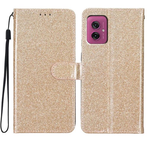 Funda de Cuero con Tapa y Purpurina para Motorola Moto G55 (Dorada)