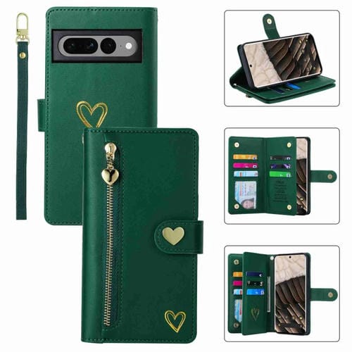 Funda de Cuero Pola Love para Google Pixel 7 Pro con Cremallera y Ranuras para Tarjetas (Verde Oscuro)