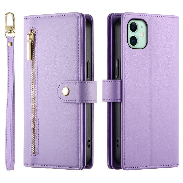 Funda de Cuero para Teléfono iPhone 11 con Nueve Ranuras para Tarjetas y Cremallera (Morado)