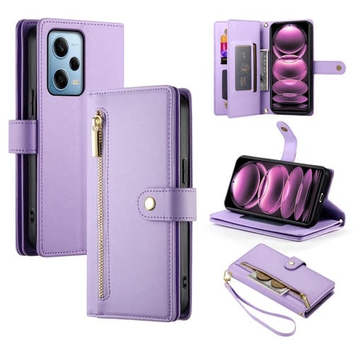 Funda de Cuero para Teléfono con Nueve Ranuras para Tarjetas y Cremallera para Redmi Note 12 Pro/Xiaomi Poco X5 Pro (Morado)