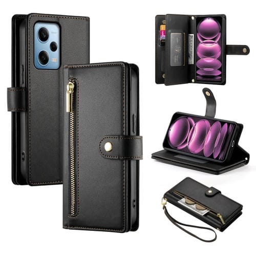 Funda de Cuero para Teléfono con Nueve Ranuras para Tarjetas y Cremallera para Redmi Note 12 Pro / Xiaomi Poco X5 Pro (Negra)