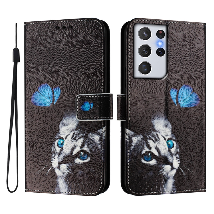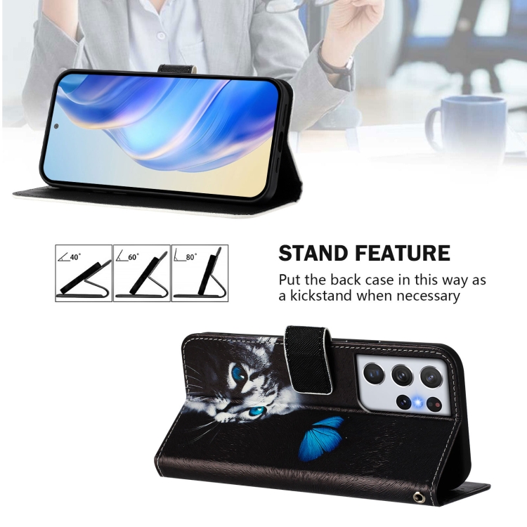 Funda de Cuero para Teléfono Samsung Galaxy S21 Ultra 5G Patrón Dibujo Artístico (Gato Mariposa)