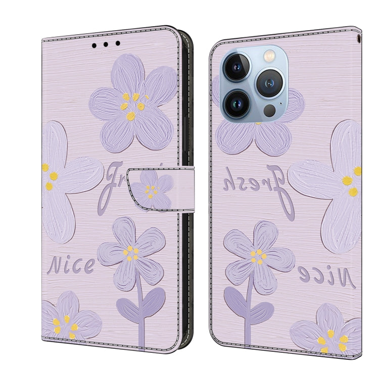 Funda de Cuero para iPhone 16 Pro Max Pintada a Mano con Pequeñas Flores Lilas