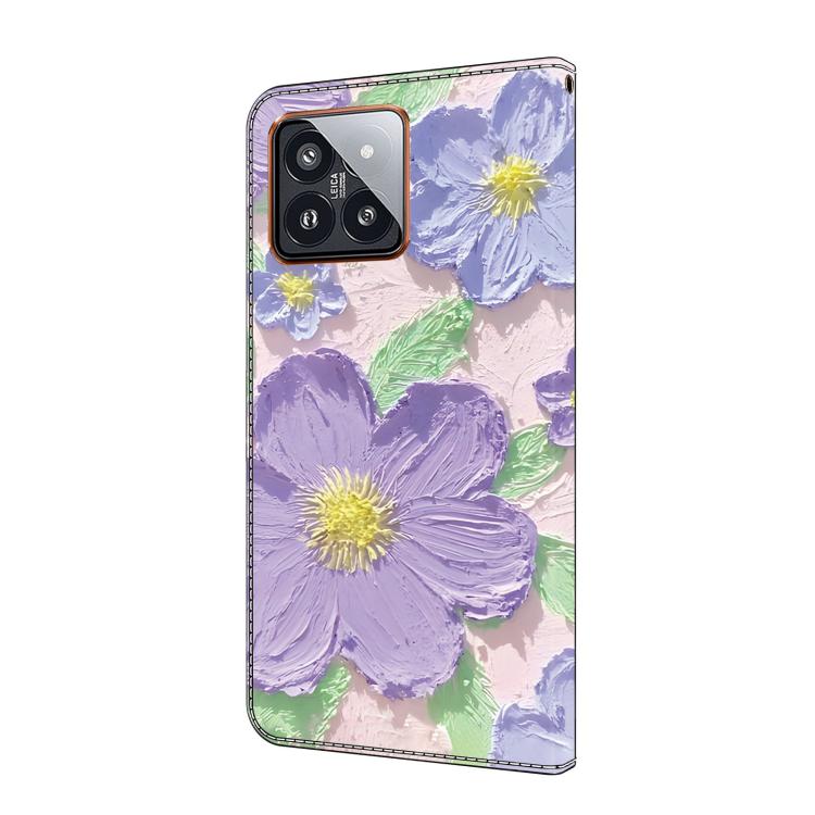 Funda De Cuero Pintada A Mano Para Teléfono Xiaomi 14 Pro (Pintura Al Óleo Con Flores Moradas)
