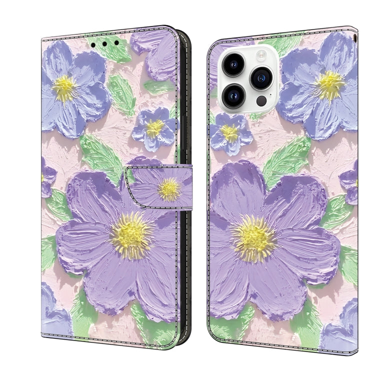 Funda de Cuero para iPhone 16 Pro Pintada al Óleo con Flores Moradas