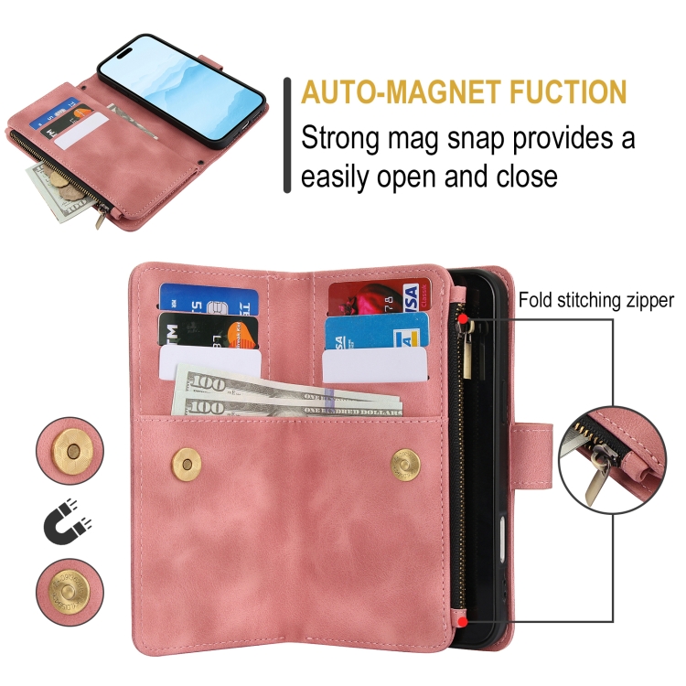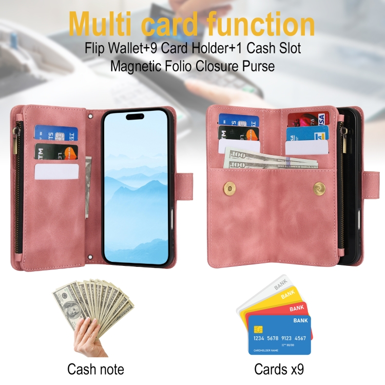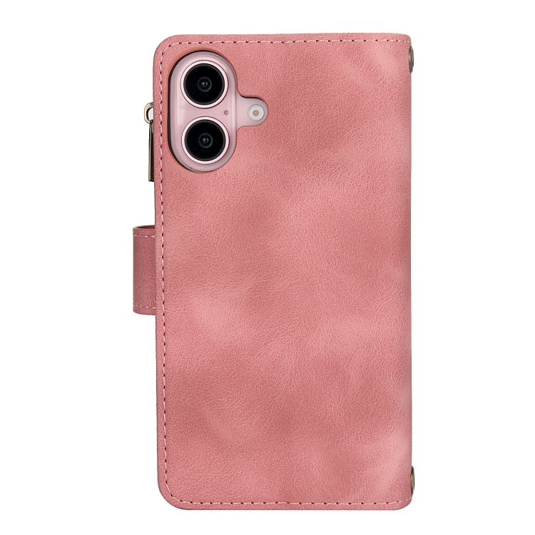 Funda de Cuero Rfid con Cremallera para iPhone 16 Plus Dream con 9 Tarjetas y Cordón (Oro Rosa)