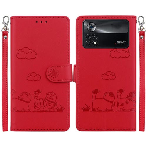 Funda de Cuero Rfid con Diseño de Gatos para Xiaomi Poco X4 Pro 5G (Roja)