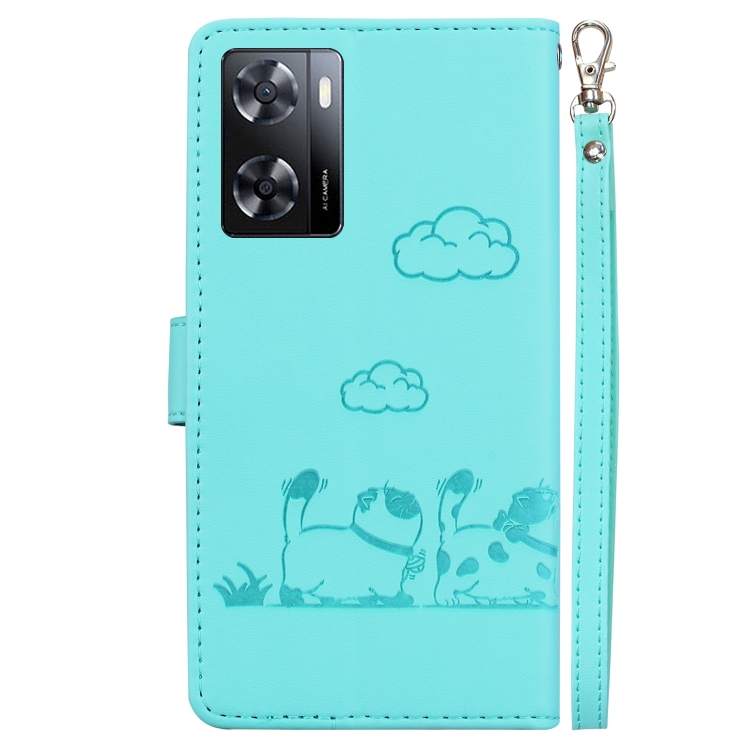 Funda de Cuero Rfid con Diseño de Gatos para Oppo A57 5G / A77 5G (Verde)