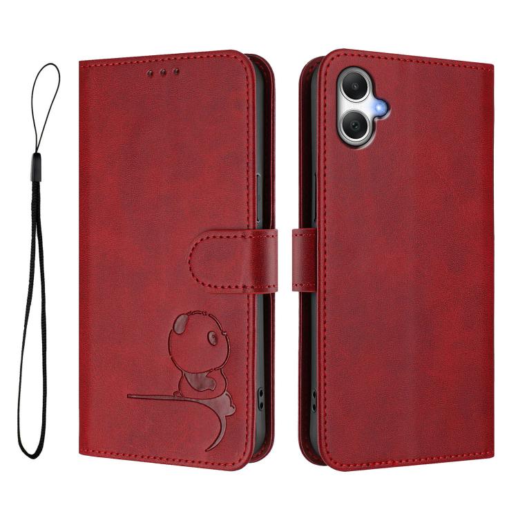 Funda de cuero RFID con estampado de panda y cordón para Samsung Galaxy A07 4G (rojo vino)