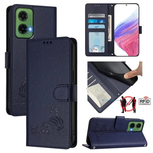 Funda de Cuero Rfid para Motorola Moto G35 con Estampado de Rata y Gato En Relieve y Cordón (Azul)