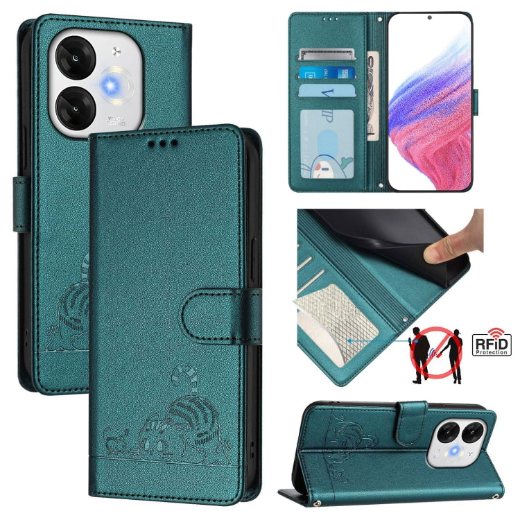 Funda de Cuero Rfid para Teléfono Itel A80 4G con Cordón Estampado Rata y Gato (Verde Pavo Real)