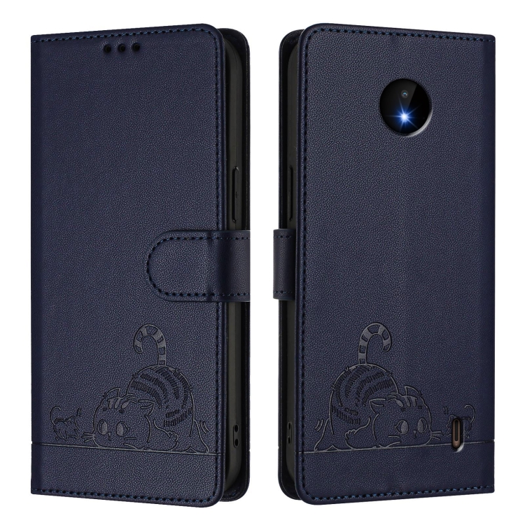 Funda de Cuero Rfid con Relieve de Gato y Rata para Nokia C10/C20 con Cordón (Azul)