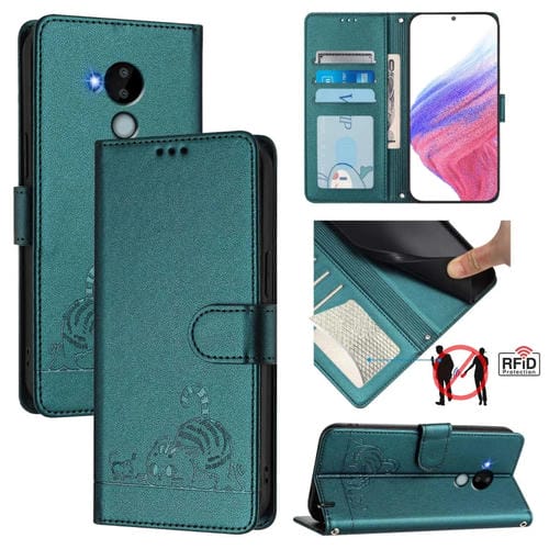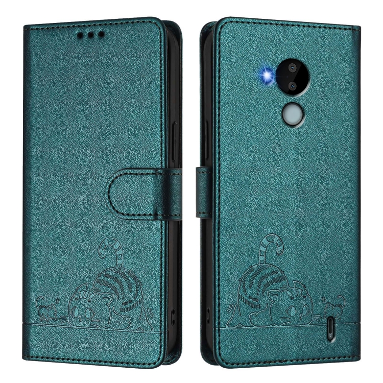 Funda de Cuero RFID para Nokia C30 con Relieve de Gato y Rata y Cordón (Verde Pavo Real)