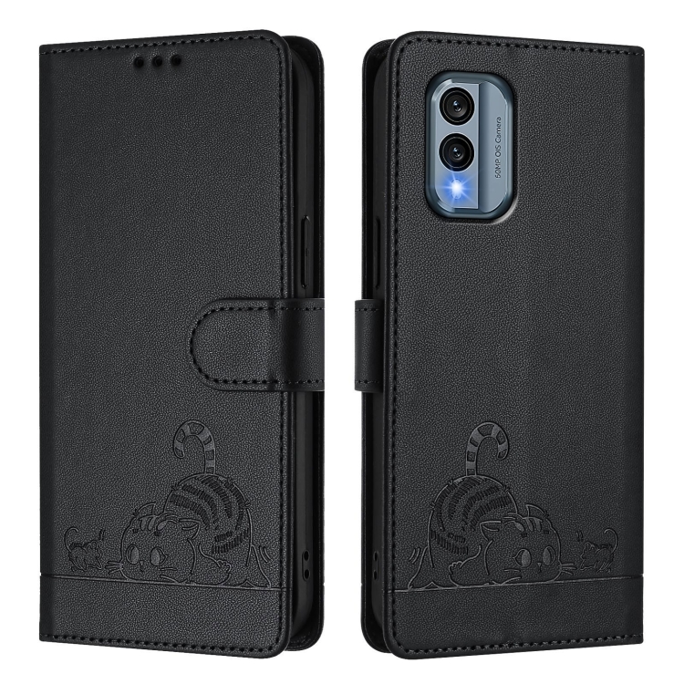 Funda de Cuero Rfid con Relieve de Gato y Rata para Nokia X30 5G con Cordón (Negro)