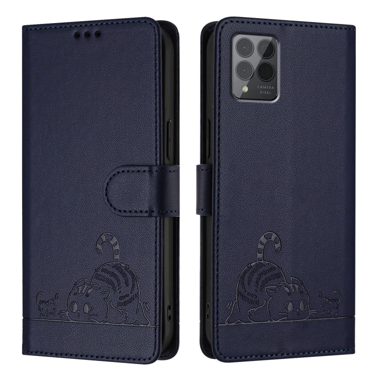 Funda de Cuero RFID con Relieve Rata de Gato para T-Mobile Revvl 6 Pro / 6X Pro con Cordón (Azul)
