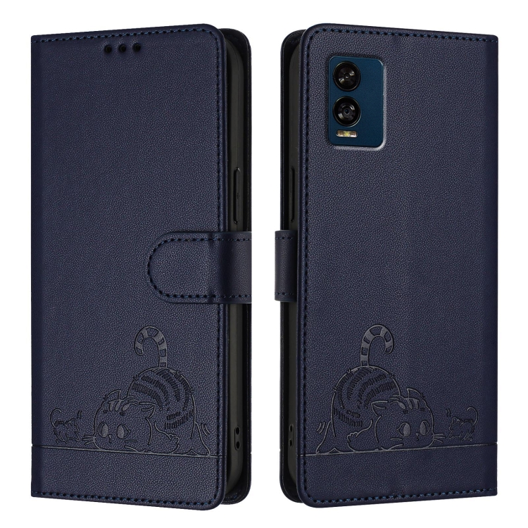 Funda de Cuero RFID para Blu View Speed 5G con Relieve de Rata y Gato y Cordón (Azul)