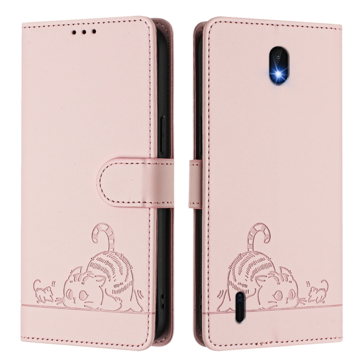 Funda de Cuero Rfid con Relieve de Rata y Gato para Nokia C01 Plus/C1 2.ª Edición con Cordón (Rosa)