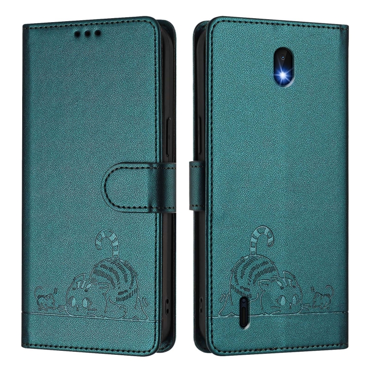 Funda de Cuero RFID para Nokia C01 Plus/C1 2.ª Edición con Relieve de Rata y Gato y Cordón (Verde Pavo Real)