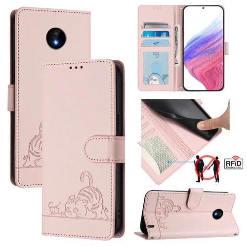 Funda de Cuero Rfid con Relieve de Rata y Gato para Nokia C10/C20 con Cordón (Rosa)
