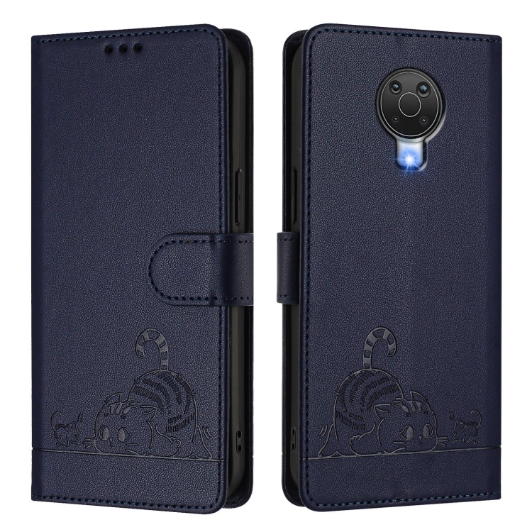 Funda de Cuero Rfid con Relieve de Rata y Gato para Nokia G20/G10 con Cordón (Azul)