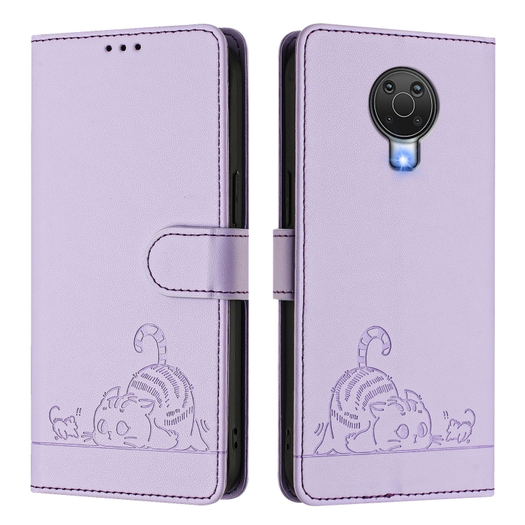 Funda de Cuero RFID con Relieve de Rata y Gato para Nokia G20/G10 con Cordón (Morado)