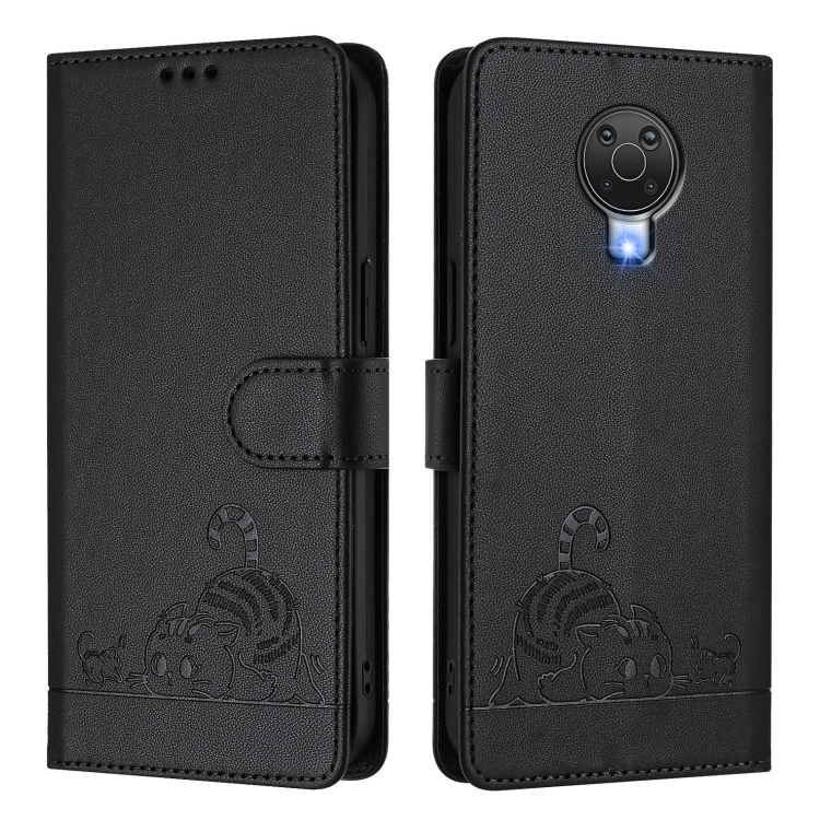 Funda de Cuero Rfid para Nokia G20/G10 con Relieve de Rata y Gato y Cordón (Negro)